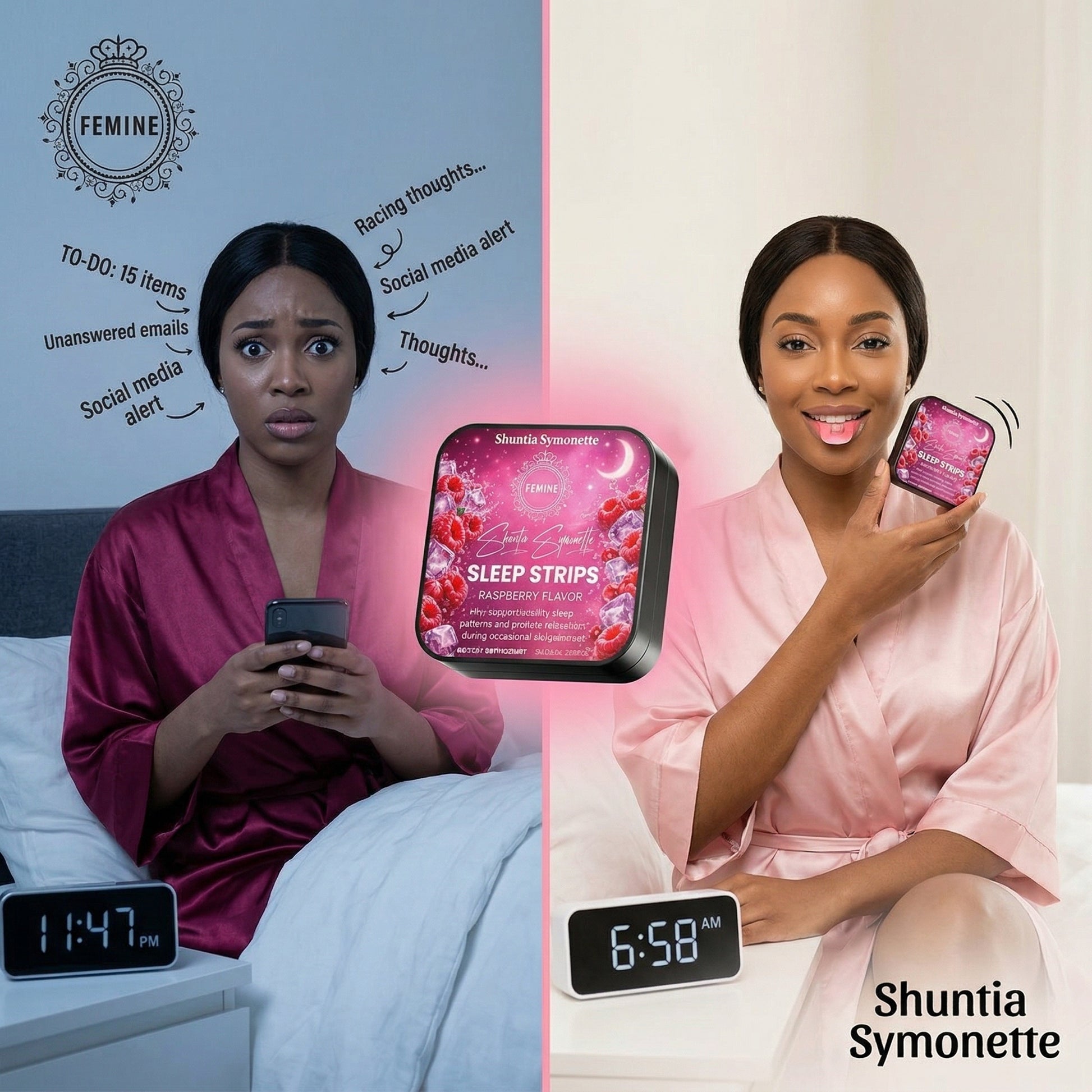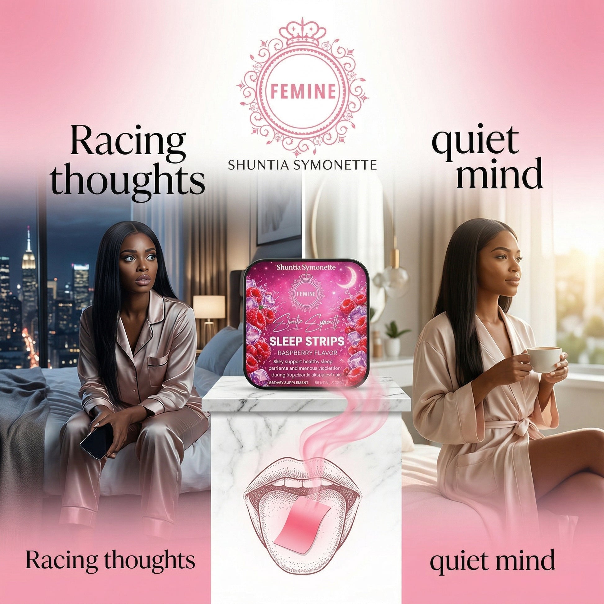 Sleep Strips are chic, fast-dissolving oral strips designed to help you relax, unwind, and slip into deeper, more peaceful sleep. They melt on your tongue and go to work quickly, supporting calm so you can fall asleep easier and wake up feeling softer, rested, and refreshed.